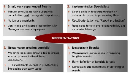 We operate in small, very experienced teams with a strong focus and track record in implementation. Our team comprises of experts which cover almost all expertise areas across all value creation dimensions. And given the managerial backgrounds of our consultants, we are prepared to take managerial responsibility in an ad interim status if needed.
