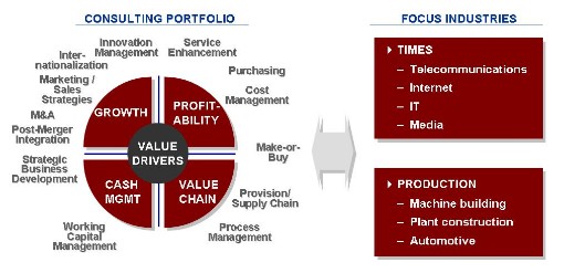To do this, we have built a range of areas of expertise which go across all dimensions of value drivers of high tech and production companies (s. also exhibit below).